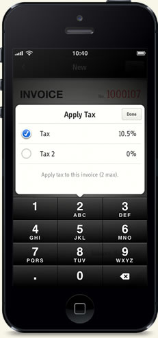 When adding an invoice line just tap "Tax" to access the tax view. Add a tax with your rate to apply it to your invoice.